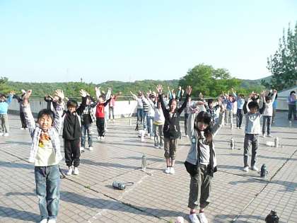 野外学習 14 公開日 2011/05/18 更新日 2011/05/18 学校の様子 朝の集いの様子がはいりました。 自然の家の屋上の「展望テラス」に集合して、健康観察やラジオ体操をしました。 気持ちの良い青空の下、胸一杯に吸った森の中の空気の味はどうでしたか?