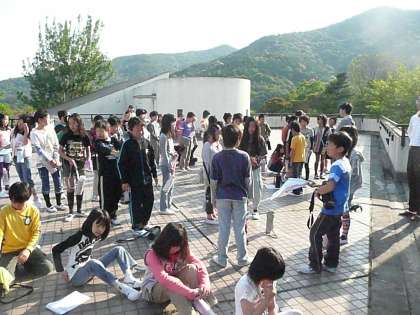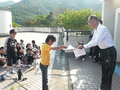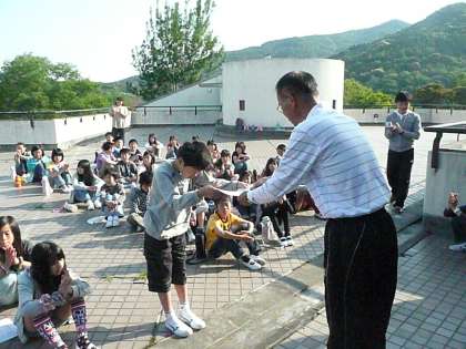 野外学習 24 公開日 2011/05/19 更新日 2011/05/19 学校の様子 本日、12:40頃解散式を行い全員元気に帰宅しました。 まず、今朝の朝の集いの様子です。昨日のキャンプファイヤーのスタンツの表彰をおこないました。