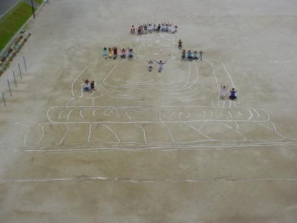 5月16日(水)社会の学習で奈良時代を学習している6年生が、運動場に実物大の「奈良の大仏」を描きました。