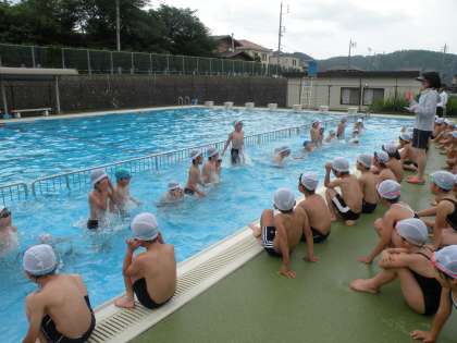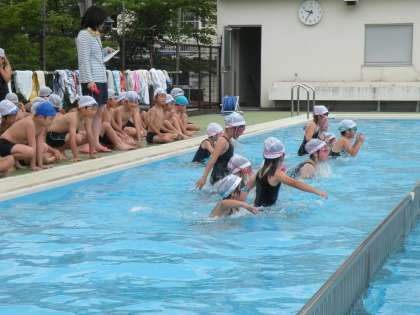 2年生が今年初めてのプール指導を行いました。水になれることから始まって、