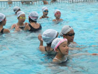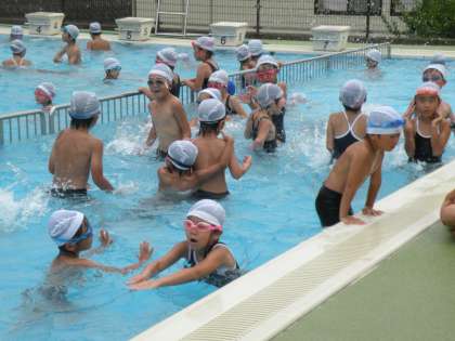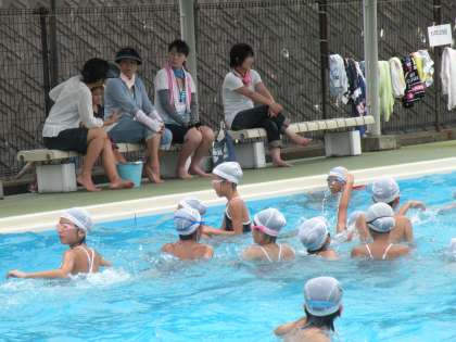 夏休みプール指導 公開日 2011/07/21 更新日 2011/07/21 学校の様子 いよいよ、待ちに待った夏休みが始まりました。 初日の今日は、プール指導の日です。薄曇りで、肌寒さを感じた子もいたようですが元気に水しぶきを上げていました。今日集まった元気な玉川っ子は160人、3人の先生と4人のPTAのおかあさんたちに見守られながら元気に泳いでいました。