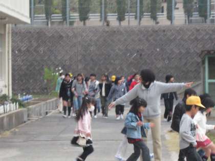 今回の訓練は、20分放課に緊急地震速報を受信し、注意を呼びかけた後大きな地震が来たとの設定で行いました。運動場で遊んでいた子どもたちや校舎内の子どもたちは、すぐに自分の身を守り、先生方の指示で運動場へ避難しました。