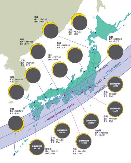2012年5月21日朝、金環日食が観測できます。日本国内で見られる金環食は1987年の沖縄以来のことです。本州で見ることができたのは1883年以来約130年ぶりです。また次に見られる金環日食は2030年(北海道)、その後は2041年(若狭湾〜伊豆半島)と、非常に珍しい現象です。