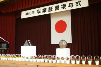 卒業式の開式は、9:30ですが、保護者の皆様は9:00〜9:15受付を行います。9:15までには式場へお入り下さい。卒業生入場は、9:30ごろです。式の終了は、  10:40頃、下校は、11:30頃を予定しています。よろしくお願いします。