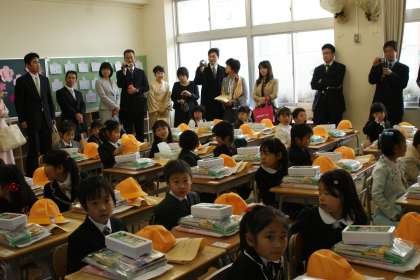 おうちの人に手を引かれた、小さな紳士と淑女が校門をくぐってきました。
