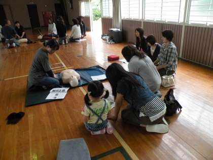 PTAふれあい教育セミナーとして、救急法の講習会を開きました。心肺蘇生とAEDの体験です。PTAの医院・役員さんたちは夏休みプール開放のお手伝いをしていただきます。