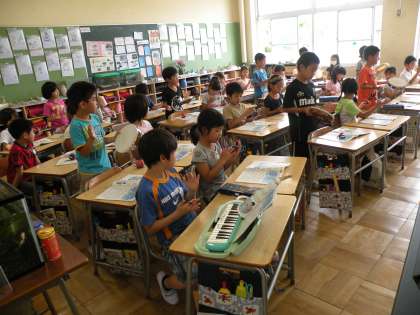 2年生2組の音楽の時間です。3拍子の曲で宮地先生の伴奏に合わせてタンブリンとカスタネットでリズムをとります。