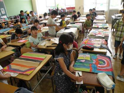 3年1組の図工の時間です。大きな紙袋に好きな絵を描いたり、ポケットを付けたりしてお気に入りの洋服を作りました。