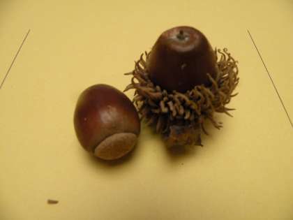 コルクの原料にもなるこのアベマキですが、どんぐりは丸くてコナラに比べて大きいのが特徴です。2枚目の写真にあるように、時々きれいな丸い穴が開いているものがあります。これはコナラシギゾウムシ、ハイイロチョッキリなどの幼虫が出てきた穴です。