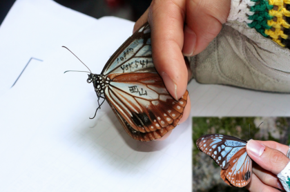 下の写真は、2011年10月10日に和歌山県から放たれて、83日後に約2,500 km離れた香港で捕獲されたアサギマダラです。マーキングが見えますか?