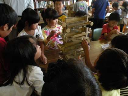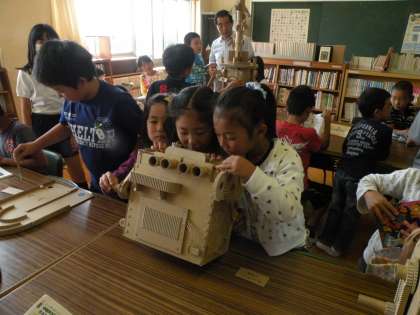 以前お知らせしたように、本日から高蔵寺在住の村田祐一郎さんの作品展を図書室で行っています。段ボールで作られた、回る絵本やコリントゲーム、エンジン模型と夢がいっぱいです。放課にはたくさんの子どもたちが、手にとって動かしていました。どの子も笑顔がいっぱい、とても楽しそうに過ごしていました。