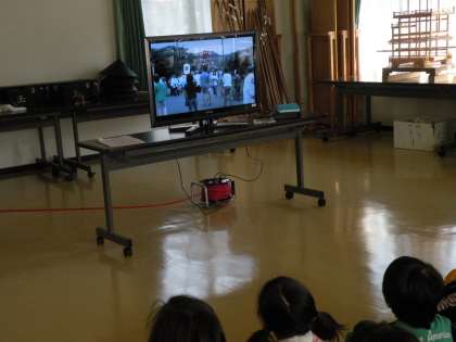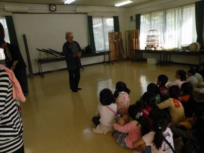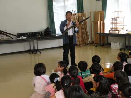 2年生が玉野町へ出かけ、地域の皆さんから昔から伝わるお祭りの事をうかがいました。お祭りで使う火縄銃や夏のお祭りの山車の模型、棒の手など興味津々の様子でした。