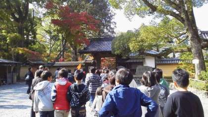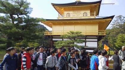 修学旅行4 金閣寺 公開日 2012/11/07 更新日 2012/11/07 学校の様子 いい天気の金閣寺。本物を目の前に、みんな興奮していました。ほどよくもみじも色づいていました。外国からの観光客の方も多く、一緒に写真をとってもらおうと、英語と身ぶり手振りで頑張って話しかけていました。