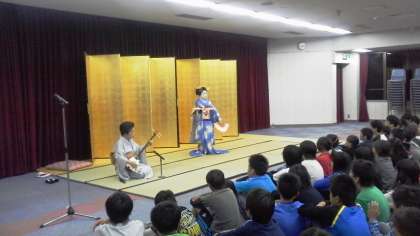 夕食のあと、小野小学校といっしょに舞妓鑑賞体験をおこないました。三味線にあわせて踊る舞妓さんの美しさに、みんなうっとりでした。