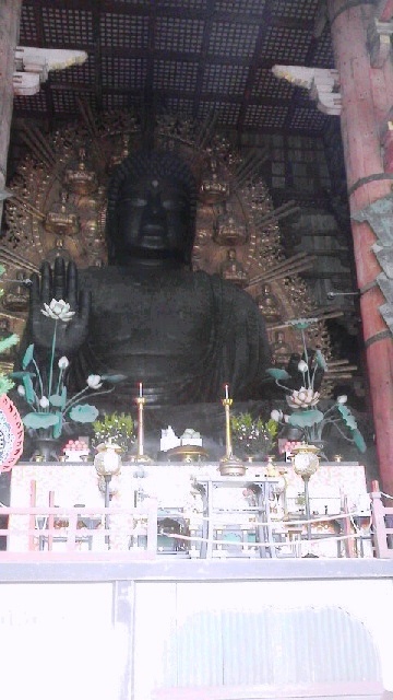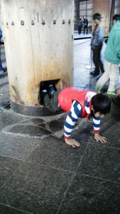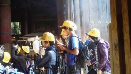 実際に見た大仏の大きさにみんなびっくり。「くぐると幸せになれるという奈良の大仏の鼻の穴」と同じ大きさの穴が柱に。たくさんの児童が挑戦してみました。
