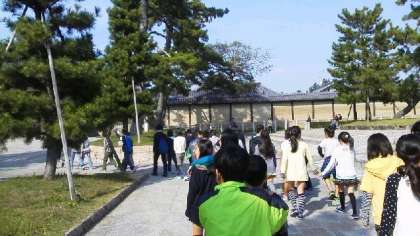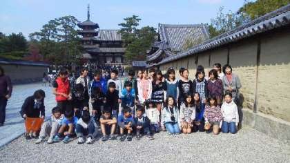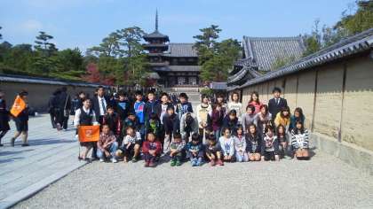 法隆寺に到着しました。みんなそろって記念撮影。天気も上々、最後の見学地です。