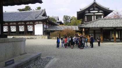 法隆寺を見学中です。奈良での鹿と走りすぎてしまってみんな眠たそうですが、ついに最後の見学地となりました。