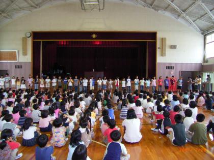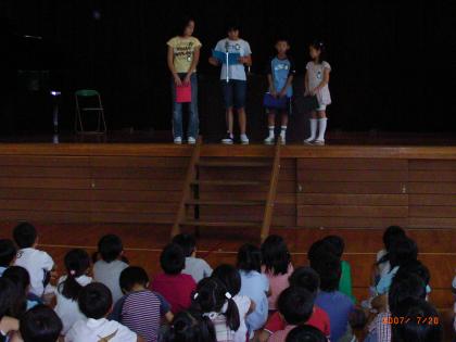 1学期 終業式 公開日 2007/11/01 更新日 2007/11/01 学校の様子 7月20日(金)は、終業式でした。 校長先生のお話をうかがった後、3年生と6年生の代表児童の意見発表がありました。 終業式後には、夏休みに行われる陸上大会の選手の激励会をしました。