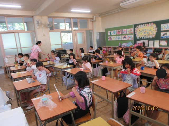 歯科衛生士さんによる歯磨き指導がありました。6歳臼歯についてや、まだ生え揃っていない小さな歯の磨き方を教えていただきました。真剣に話を聞いて上手に歯磨きができました。
