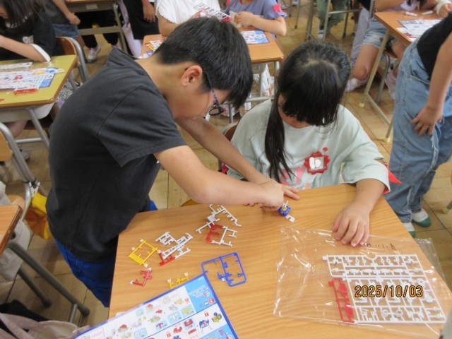 2年生に教えてもらいながら、ガンダムのプラモデル作りをしました。細かいパーツを丁寧に組み合わせながら、1時間であっという間に完成できました。