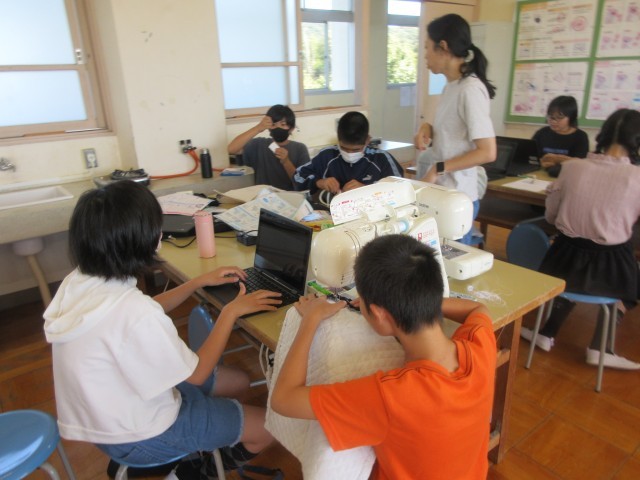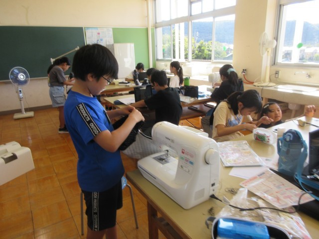 ミシンを使って、ナップザックを作っています。今日で完成しました。