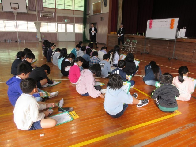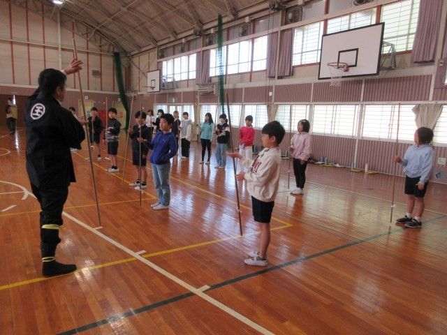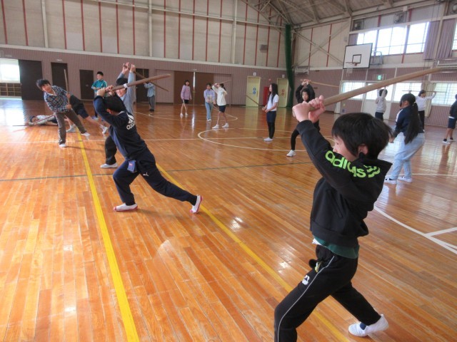 玉野郷土芸能保存会の方に来ていただき、「棒の手」の歴史、流派、玉野町の祭りなどについて話をしていただきました。次に「棒」と「太刀」に分かれて型を教えていただきました。みんな「難しい」と言いながらも楽しそうに練習していました。