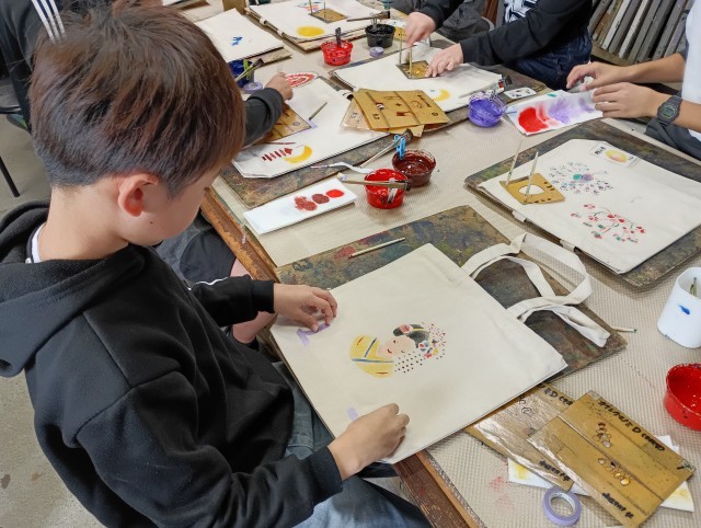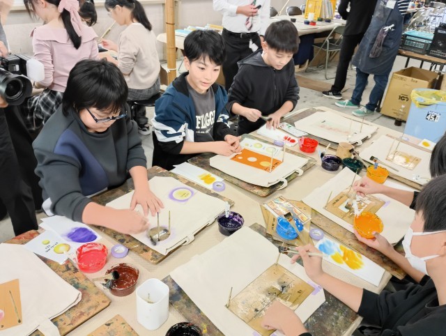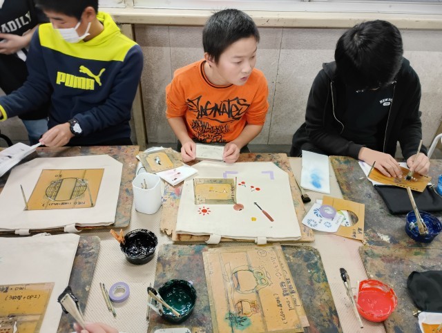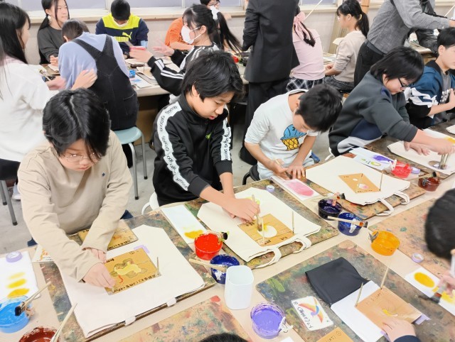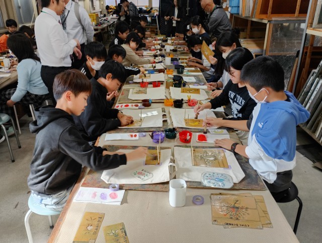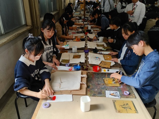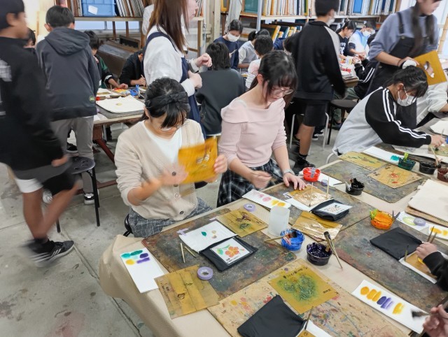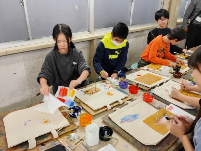 友禅染体験を行いました。みんな、綺麗に作ることができました。家に帰ったらアイロンがけを忘れないでくださいね。
