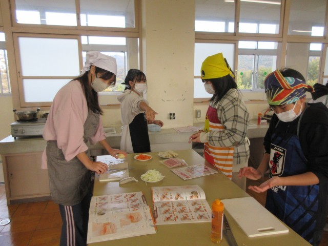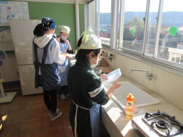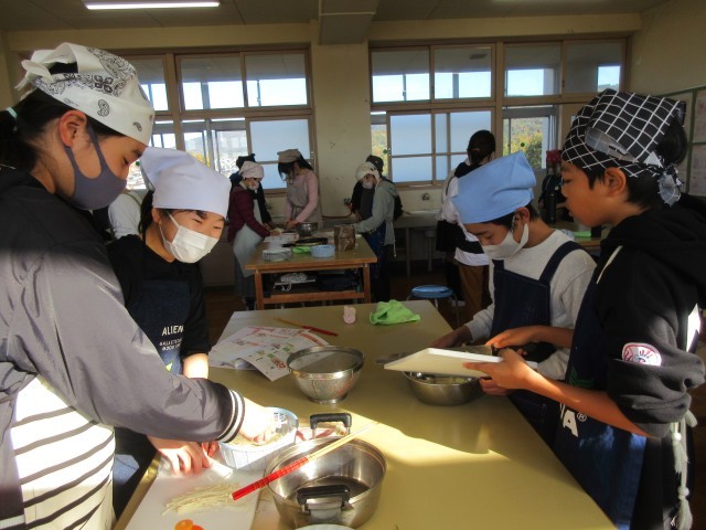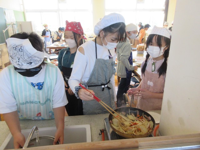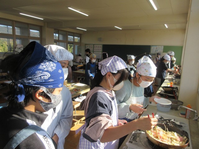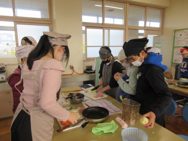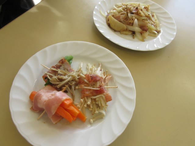 1・2組合同で、「野菜のベーコン巻き」と「ベーコンポテト」を作りました。