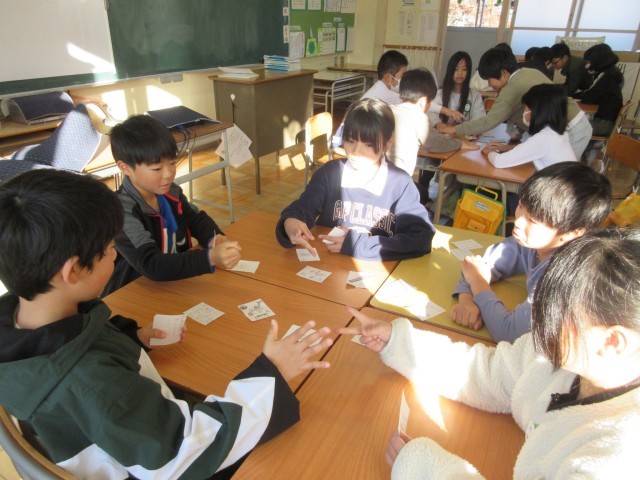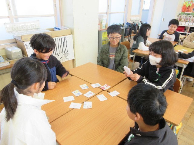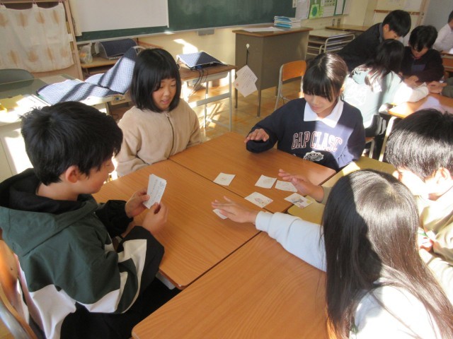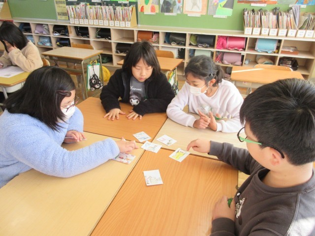 国語「冬の楽しみ」の単元で、冬の行事の楽しさを知らせるかるたを作り、グループごとにかるた取りをしました。