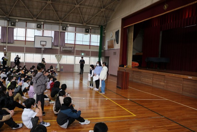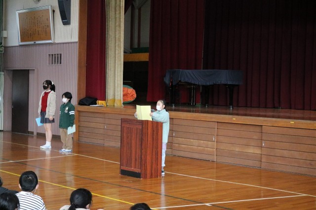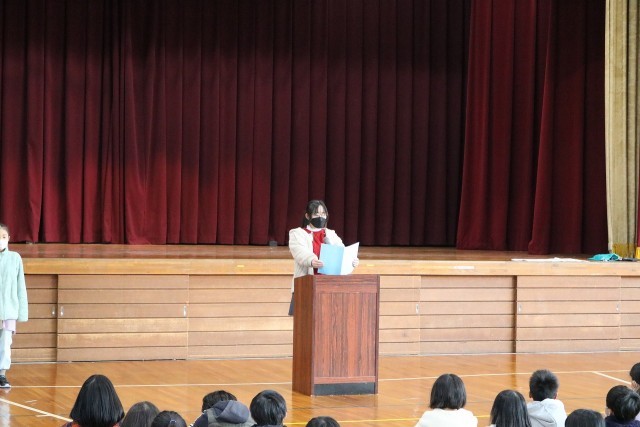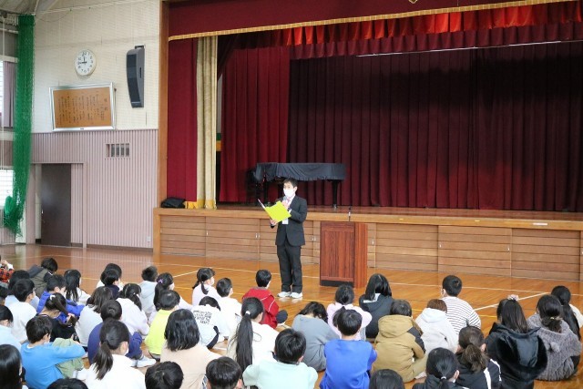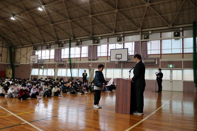 終業式を行いました 公開日 2025/12/23 更新日 2025/12/23 学校の様子 12月23日(火)終業式を行いました。校長先生のお話を聞いたあと、3年生と6年生の体表児童から「2学期にがんばったこと」の発表を聞きました。校歌を元気よく歌い、終業式を終わりました。その後、表彰を行い、生活指導の話を聞きました。学級では、担任の先生からお話を聞き、通知表を渡されました。冬休みも規則正しい生活を行い、体調管理に気を付けてくださいね。 +7