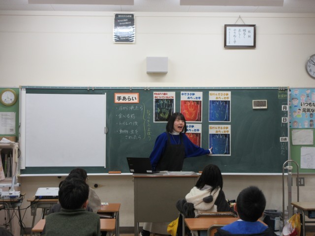 本日は養護教諭から手洗いの大切さについて学びました。