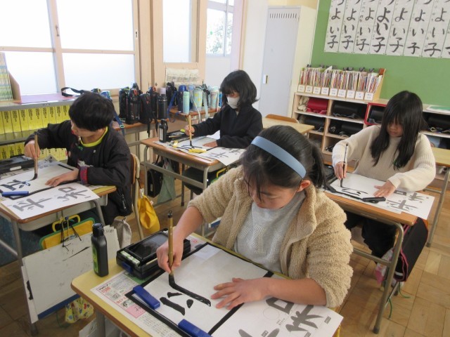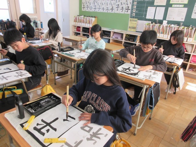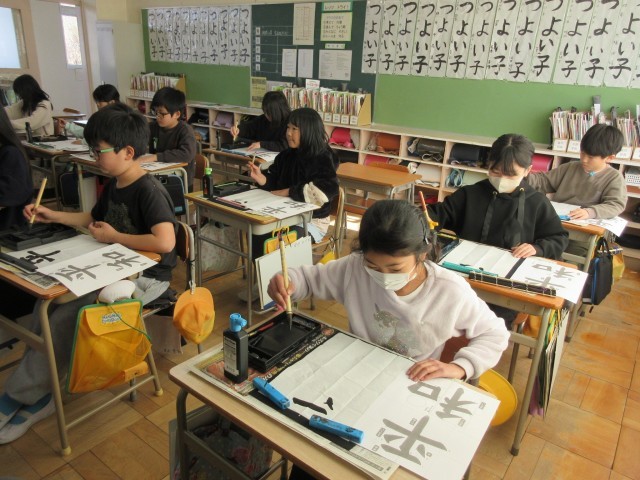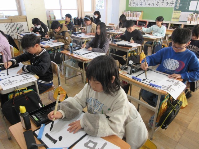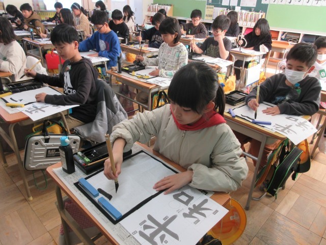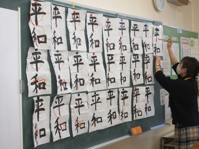 今日は書道科講師による書写の授業がありました。みんなで「平和」を書きました。手本を見て始筆の場所を確かめながら丁寧に練習しました。少し右上がりに書く、横線の長さに気を付ける、「へん」と「つくり」のバランスに気を付けるなどいろいろなことを教えてもらいました。