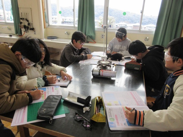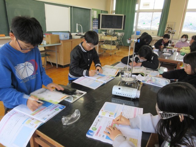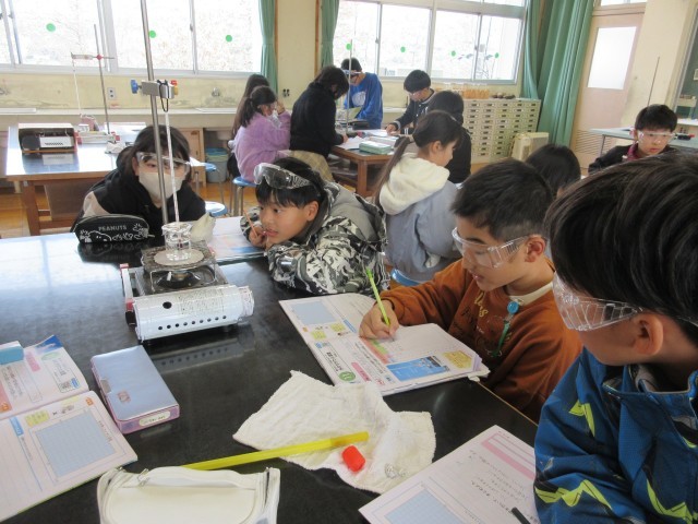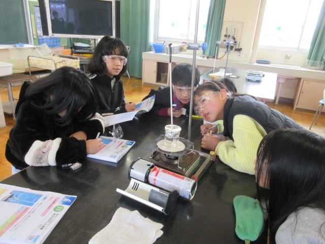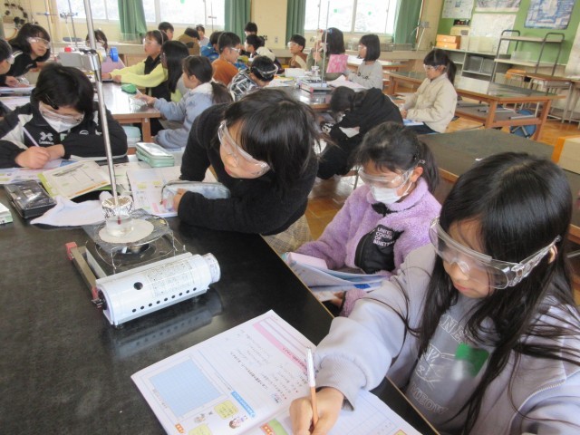 理科「水のすがたと温度」の学習に入りました。今日は熱したときの水の温度や様子の変化について調べる実験をしました。1分ごとに熱した水の温度をはかり、その時の様子をノートに記録しました。みんな保護めがねをかけ、しっかりと観察していました。