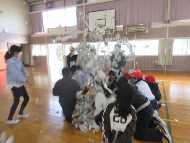 今日は新聞紙を使って、新聞紙になりきったり、リズムに乗って新聞紙を破いたりしました。