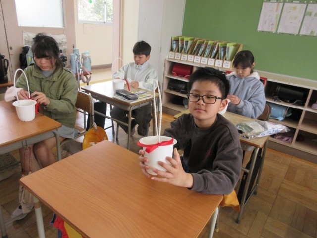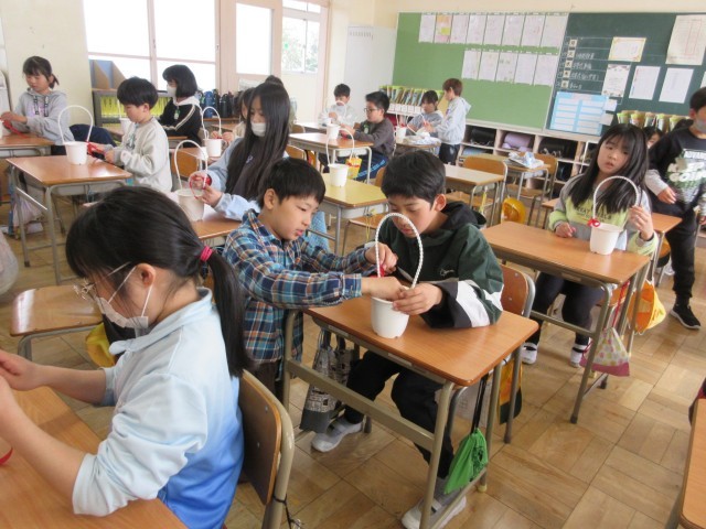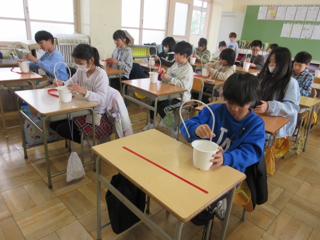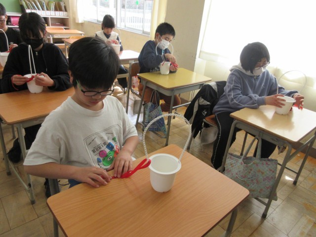 6年生に贈る植木鉢の準備をしました。リボン結びに多少手こずりましたが、上手にできました。5・6時間目の式場周辺の掃除もみんな一生懸命に取り組みました。