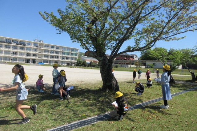 理科の授業で春の植物(桜)の様子を観察しました。枝の先をよく見て観察ノートに記録しました。