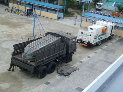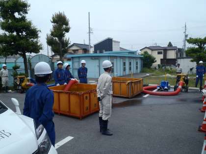 東日本大震災の時に使った自衛隊のボートだそうです。そして,内水を河川に排水する機械のデモンストレーションもプール水を使って行われました。