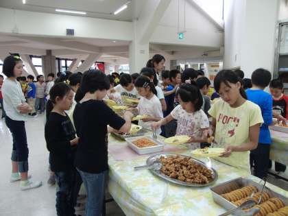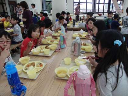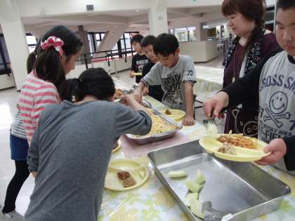 お昼にカレーをおかわりして食べたばかりなのに、17時からの夕食でもおかわりする子が多く、びっくりしました。夕食はバイキング。フライドポテトとメロンに人気が集中しました。