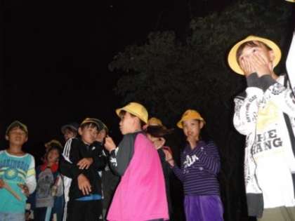 ピロティに集まって自然の家の方のお話を聞いているときは、まだ明るかったのですが、歩いているとだんだん暗くなってきました。かえるの泣き声もよく聞こえました。