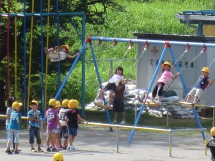 ある日の休み時間の運動場です。1年生の子ども達が、ブランコの柵の前で上手にフォーク並びをして順番を待っています。遊んでいる子は何回か漕いで楽しむと、次の子に代わっています。遊具で遊ぶときのルールが身についてきたようです。