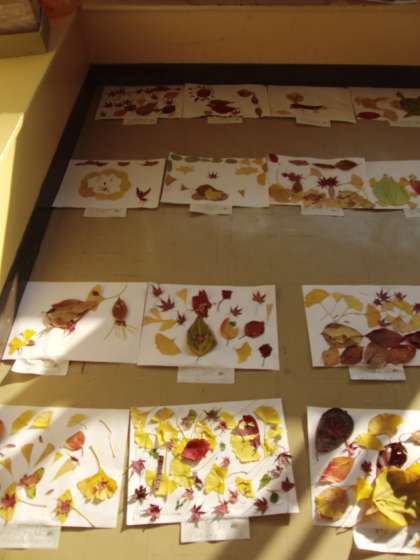 落ち葉の舞い散る季節です。色づいた葉っぱも見納めです。1年生は、落ち葉を使ってこんな作品を作りました。
