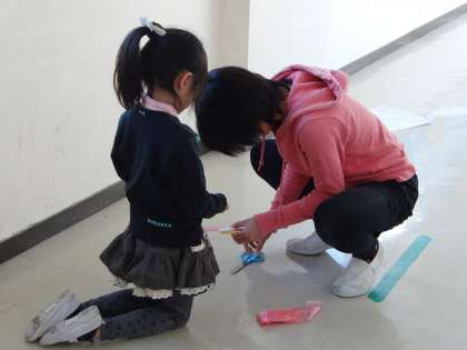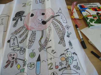 5・6年生が中心になって、低学年の糸の長さを調節しました。たこのイラストも完成した子が多く、たこあげ大会当日が楽しみです。