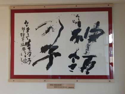 一つは職員玄関にある、原田凍谷先生の作品です。1学期に実施した3年生の「おもしろいで書」の授業のときに書いていただきました。額の下の題字は、本校の児童が書きました。