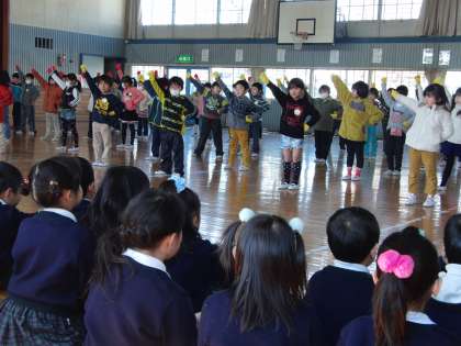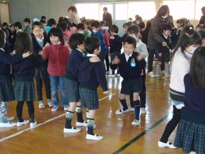 交流会は2回目なので、1年生の子ども達も余裕を持って発表することができました。練習時間は短かかったのですが、歌も踊りも上手にできたと思います。発表の後、じゃんけん列車をして遊び、交流会は終わりました。園児達は、後で、教室で授業をしている様子も見学に来てくれました。