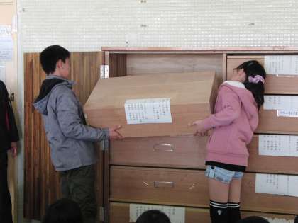 毎日通る場所ですが、中を見るのは初めてです。自分たちの作品が収納される様子を、緊張感の中、興味津々で見守っていました。