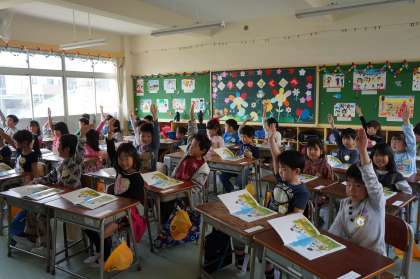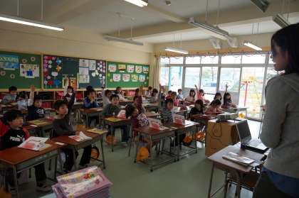 みんな、一生懸命先生のお話を聞いていました。手を挙げて発表する子もたくさんいました。1年生、がんばっています。