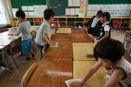 まず、当番が白衣に着替えている間に、給食係が机を水拭きします。