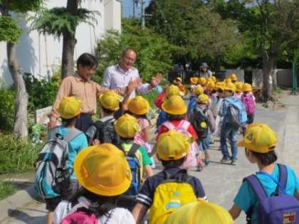 1年生は春の校外学習で下市場公園に出かけました。校長先生や教頭先生に「いってきまーす」と元気よくハイタッチ。