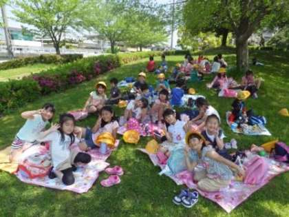 とてもよいお天気で、遊具やボールで遊んだり、おにごっこをしたり、公園にある草花で遊んだりしていました。遊んでるときから「まだかな〜」とお弁当の時間をとても楽しみにしていた子どもたち。おやつの時間も友だちと交換して楽しく過ごしていました。いい思い出ができました。
