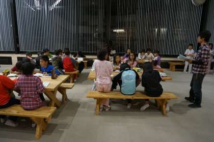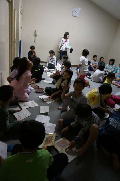 一日の終わりに反省会があります。部屋長と班長が先生からの連絡を受けて、各クラスの反省会でみんなに伝えます。しおりにメモをとり、一日の反省を書きました。
